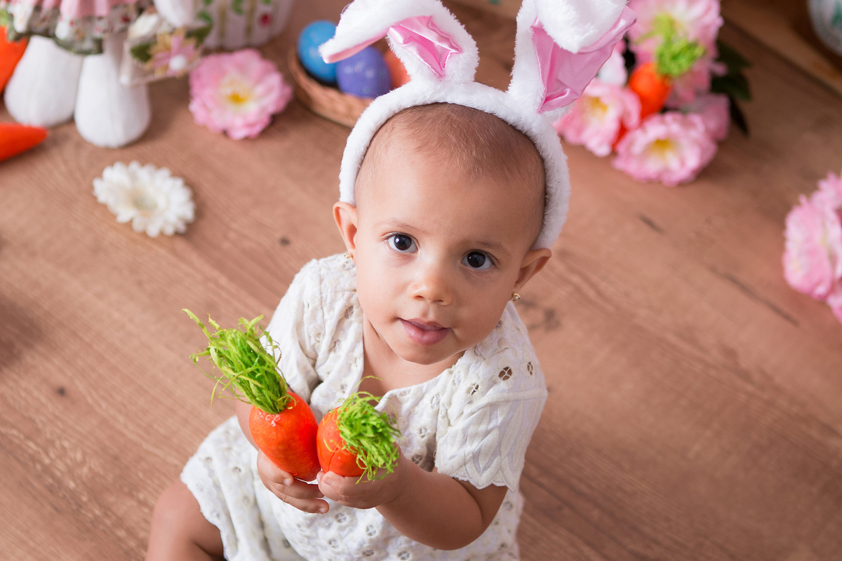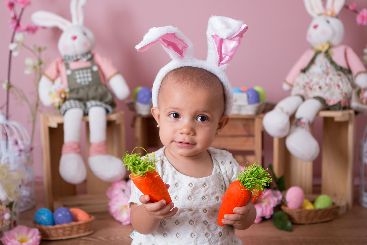 Ensaio fotográfico de páscoa, fotos de crianças de páscoa, coelhinho da páscoa, ovinhos coloridos, coelho, coelha, flores, menina, bebê, criança de 1 ano, fotos de crianças, estudio fotográfico na Mooca, fotos para crianças
